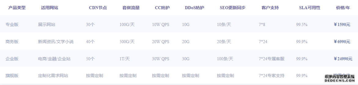 | 產品類型 | 適用網站 | CDN節點 | 套餐流量 | CC防護 | DDoS防護 | SEO更新同步 | 客戶支持 | SLA可用性 | 價格 |