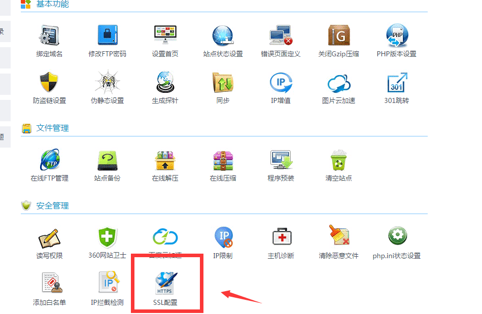 2、 登陸虛擬主機的自助管理平臺,找到自助管理平臺的安全管理,里面有個<SSL配置>選項。